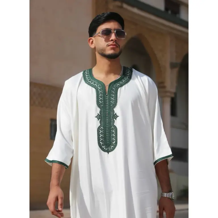 Experience effortless elegance with our gabardine cotton thobe, adorned with intricate green embroidery for a refined Moroccan touch. Its lightweight design promotes comfort in warm conditions, while the ankle-length, short-sleeve style embodies timeless tradition. Perfect for cultural gatherings, celebrations, and casual everyday wear.