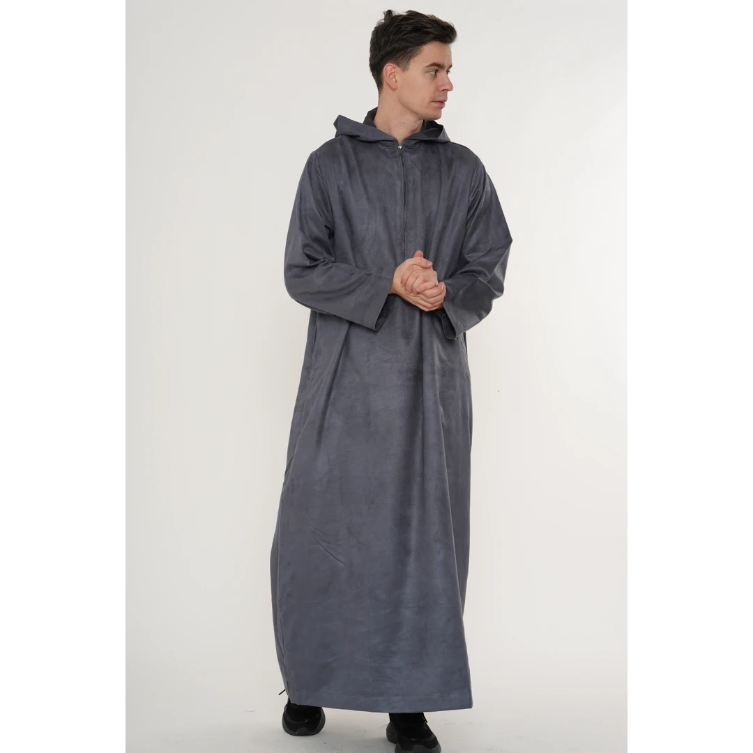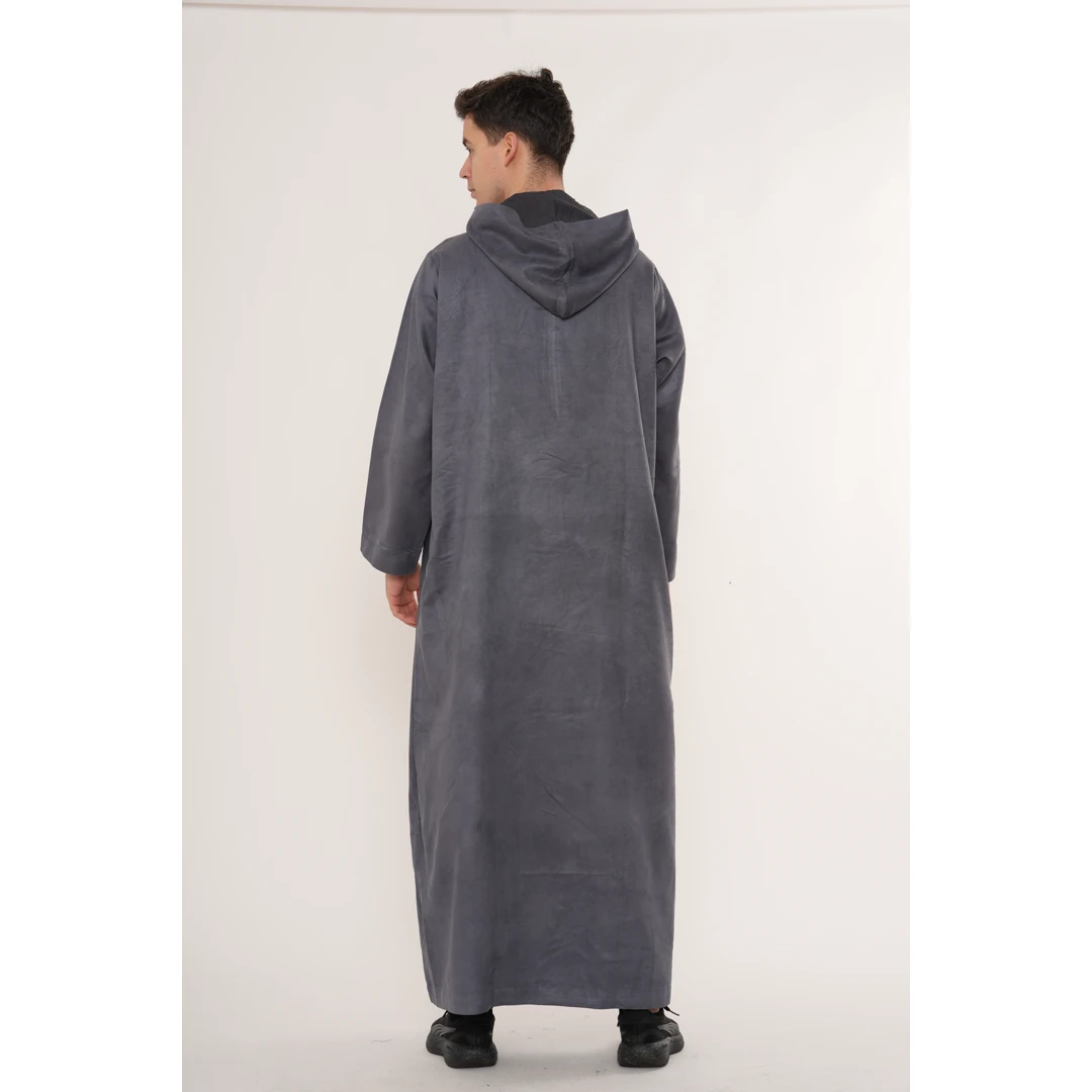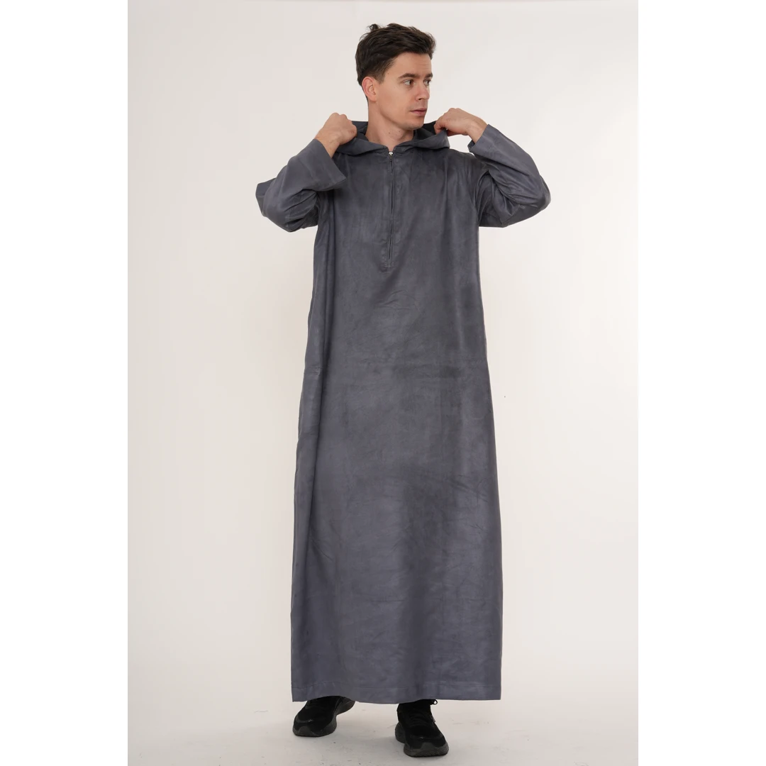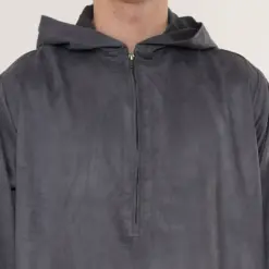 HM12 Grey Hooded Suede Thobe Emirati Omani Zipped Jubba