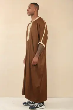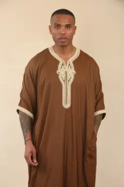 • Authentic Moroccan Heritage Design: Reflecting the artistry of Moroccan craftsmanship, this Brown-Gold Moroccan Thobe showcases exquisite embroidery, capturing the essence of Moroccan culture and tradition.