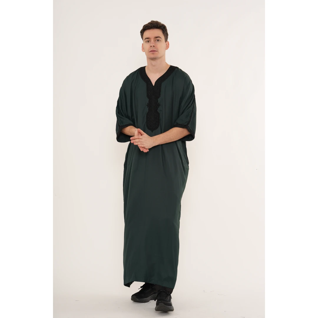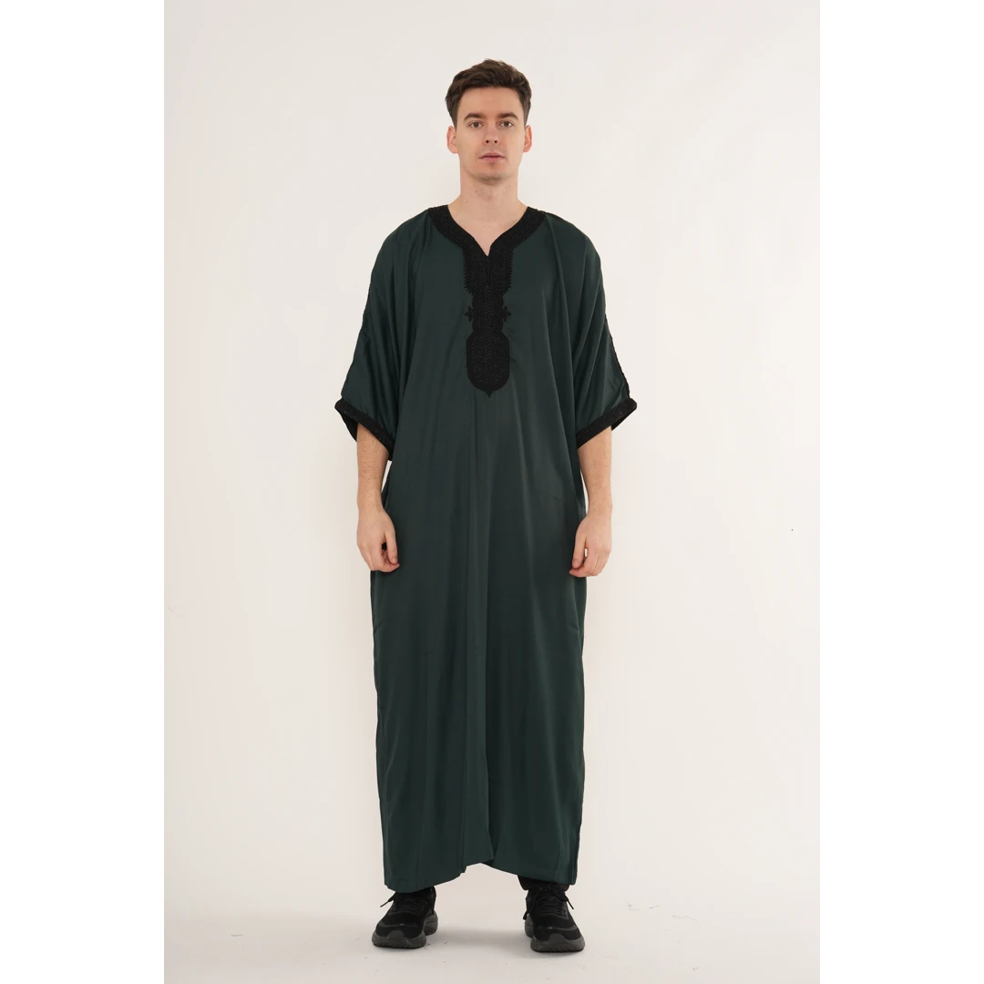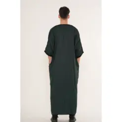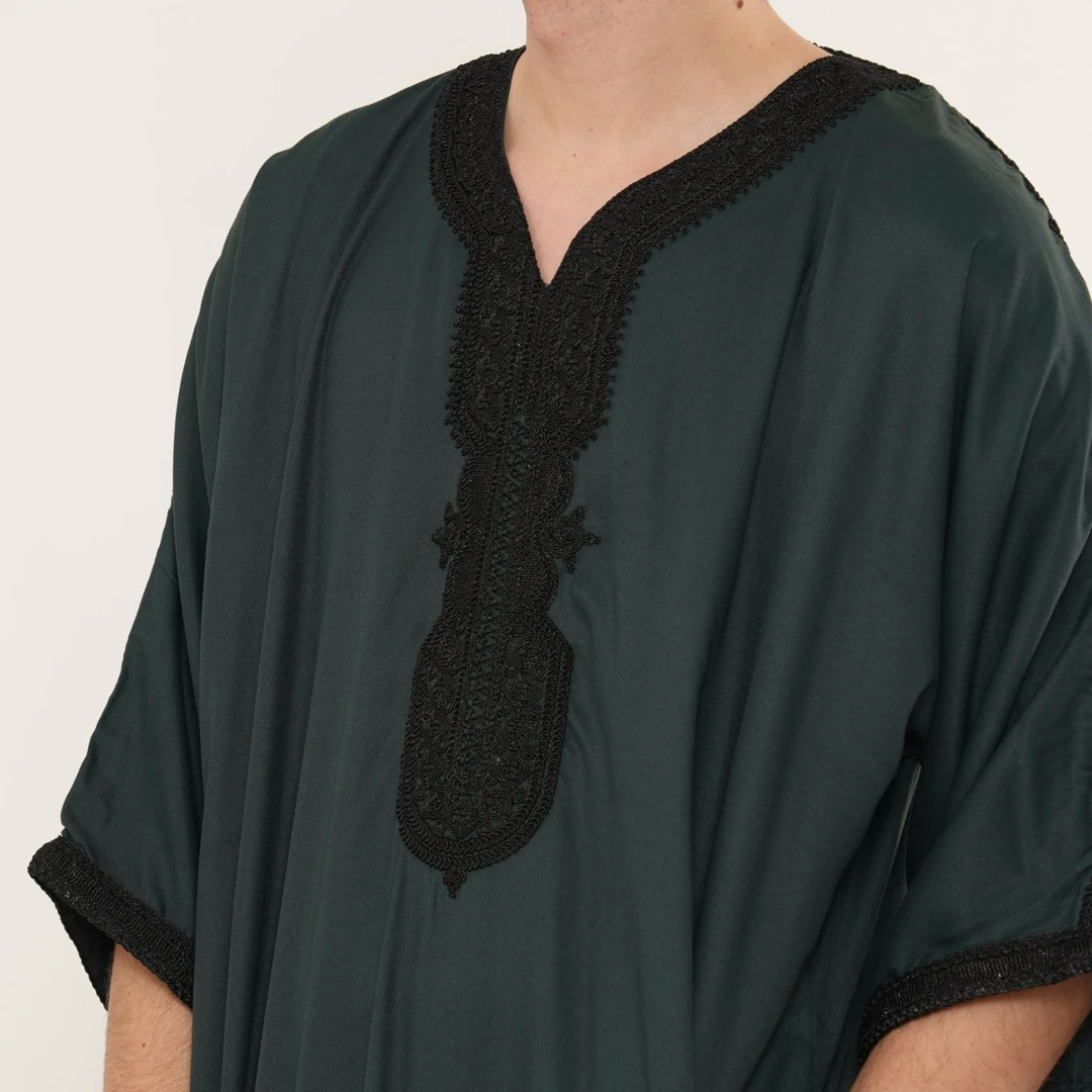 HM62 Green Moroccan Thobe Half Sleeve Gandoura Black Embroidery