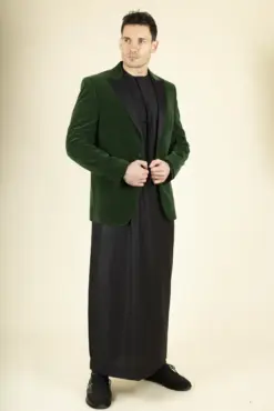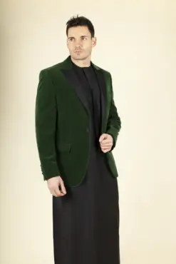 Sophisticated green velvet tuxedo blazer with black satin lapels. Elevate events with opulent charm. Versatile style for weddings and black tie occasions.