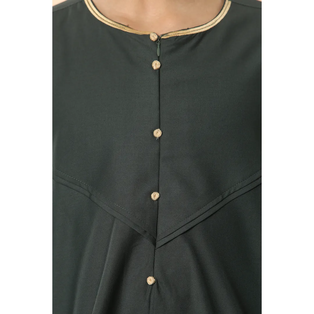 The refined gold embroidery trim around the collar and wrist edges elevates the thobe’s overall aesthetic, offering an elegant touch to this classic Islamic attire.
