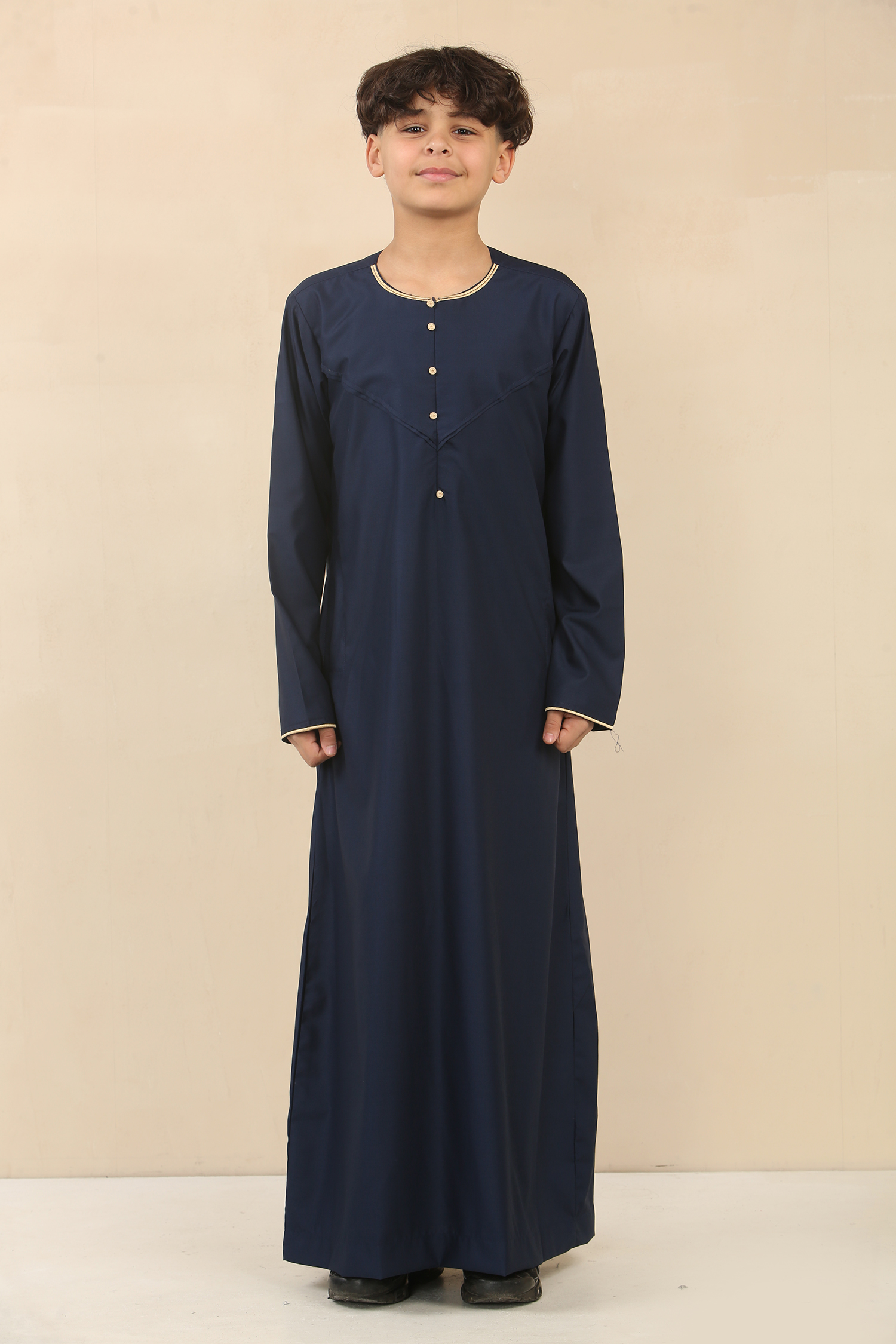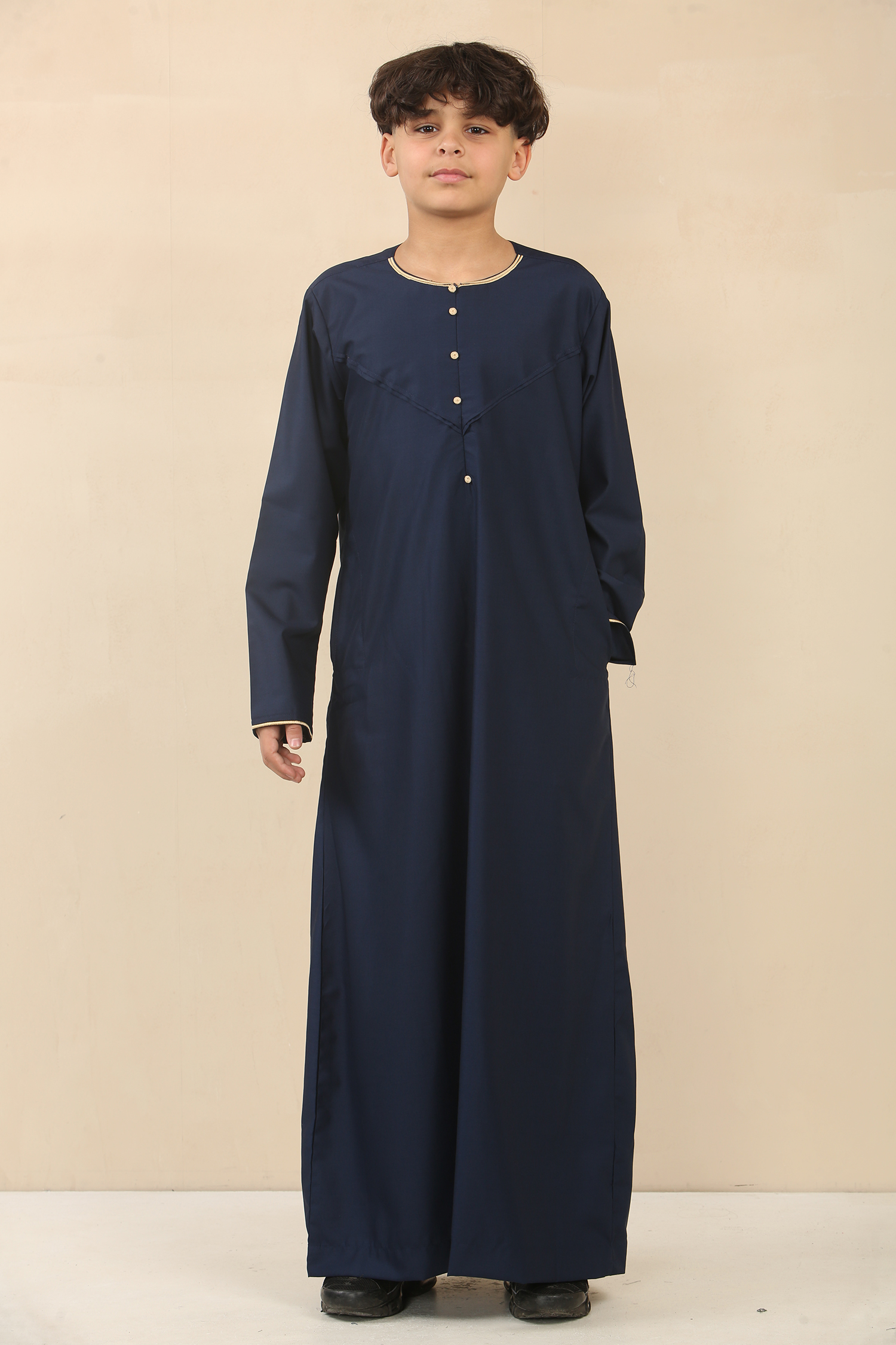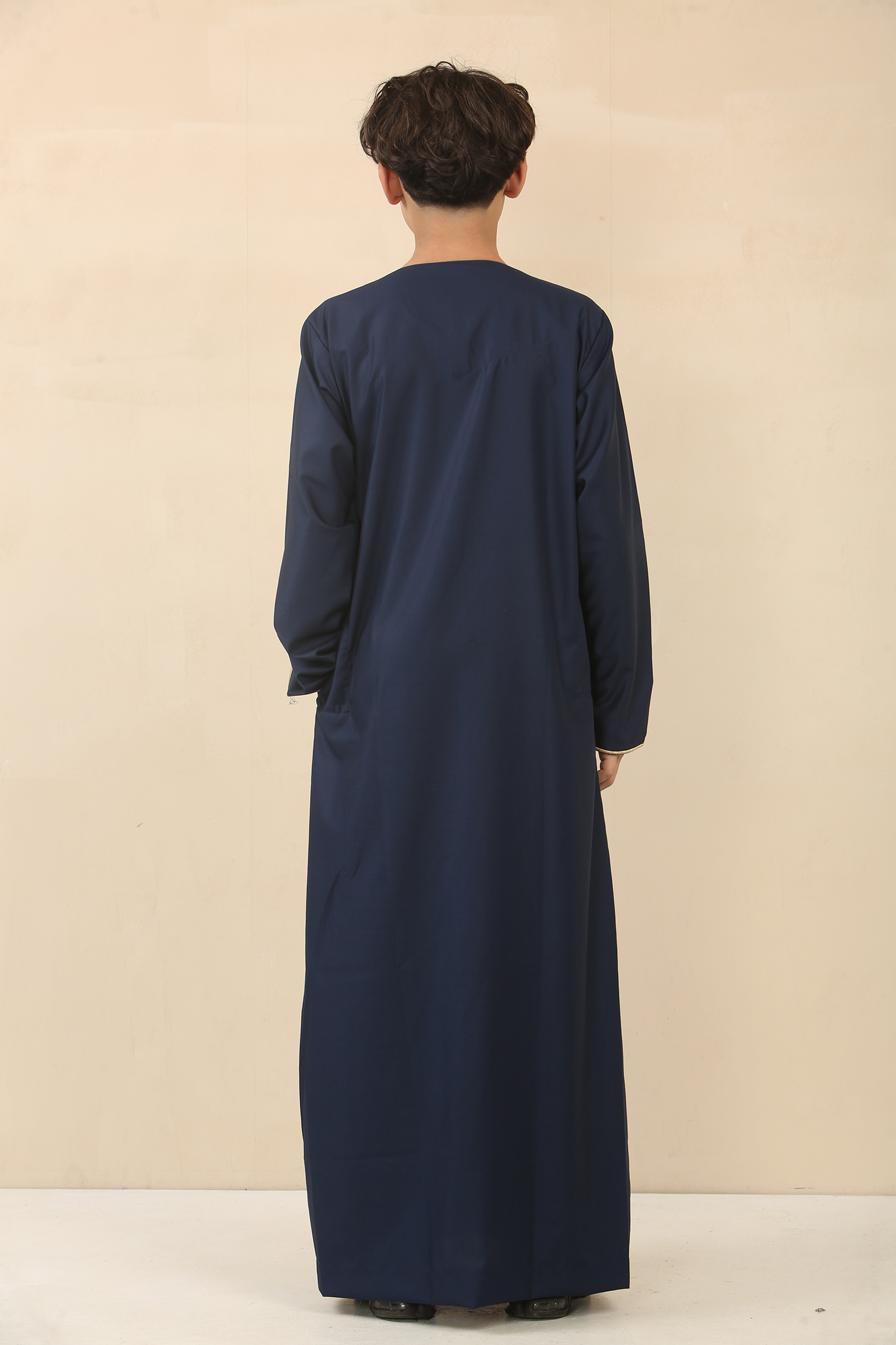 Experience Islamic kidswear at its best with our timeless ankle-length boy’s thobe, carefully fashioned from premium-quality polyester for breathable comfort and lasting durability. Elegant gold embroidery on the cuffs and collar adds a refined accent, while discreet pockets and an invisible zip closure provide everyday convenience without compromising style.