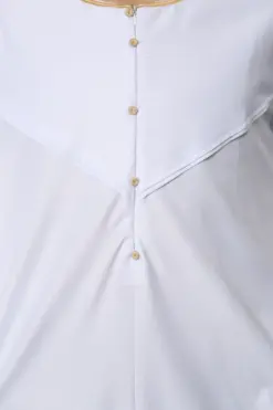 * Gold Embroidery Detailing: The elegant gold embroidery trim around the wrist edges and collar enhances the thobe’s sophisticated design, adding a refined touch to this classic Islamic attire